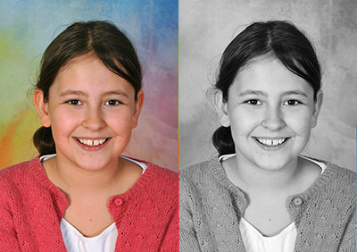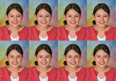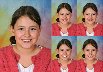 Das Bildset besteht aus einem Portraitfoto im Format 13x18 cm, einem Foto im Format 9x13 cm, Foto im Format 6x9 cm, und 2 Ausweisbilder, gefertigt von einem Bild (einer Bildnummer), dem Klassenfoto und einer Bildmappe. | |
